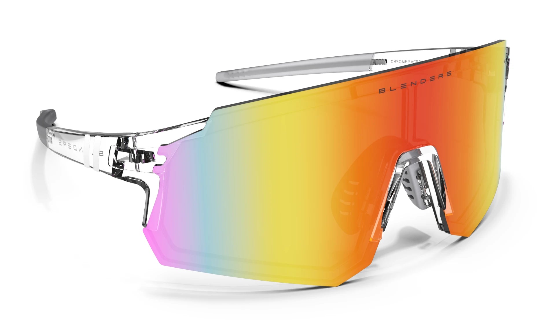 ‘Chrome Racer’ is adjustable, adaptable, and ready for wherever the day takes you. These wraparound sunglasses feature the interchangeable lens system of our ‘Deconstructo’ style, enabling you to combat changing lighting conditions on the fly. Just disengage the lens lock, pop the scratch-resistant PureBlend Lens out, and snap in a compatible replacement. ‘Chrome Racer’ is further enhanced by a durable, lightweight design and independently adjustable nose pads and temple tips for all-day comfort. Package includes an interchangeable bonus lens. //